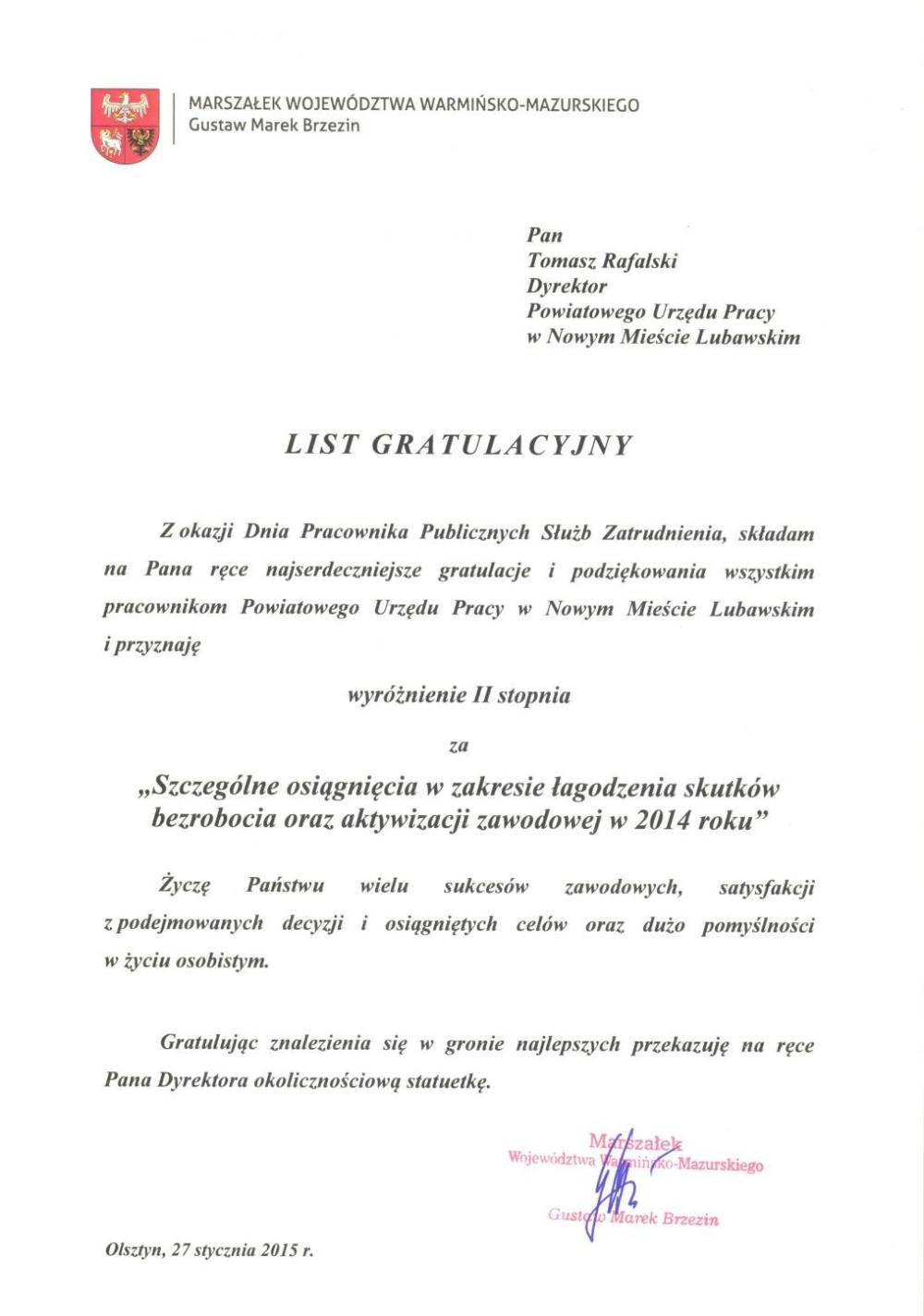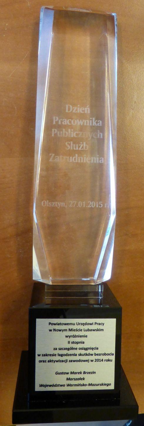 Wyróżnienie II stopnia za „Szczególne osiągnięcia w zakresie łagodzenia skutków bezrobocia oraz aktywizacji zawodowej w 2014 roku" – Powiatowy Urząd Pracy w Nowym Mieście Lubawskim